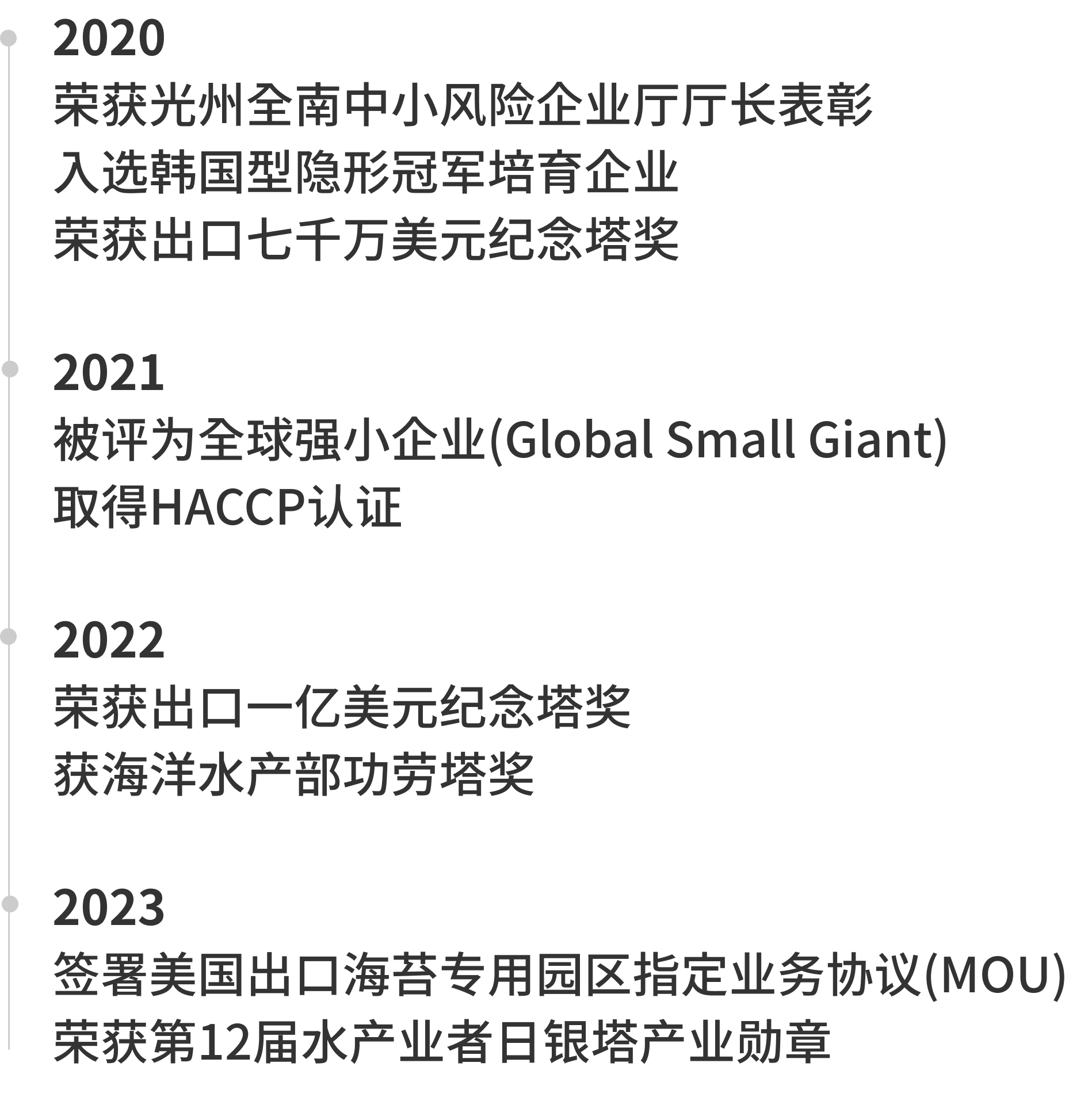 世界各地的企业。在成立仅十年间,我们成长为韩国最大规模的海苔制造企业之一,并以推动